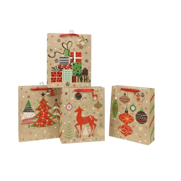 10 in stockXMAS DESIGNS ON BROWN PAPER GIFT BAG BTL 36X12.3X8.5CM 4 ASS