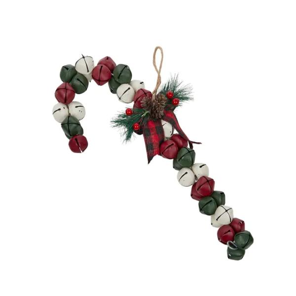 Red / White & Green Hanging Bell Cane Ornament - 41cm x 18cm