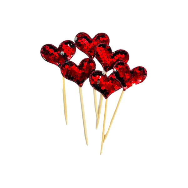 6 Pack Sequin Red Or Pink Heart Shape Cake Topper