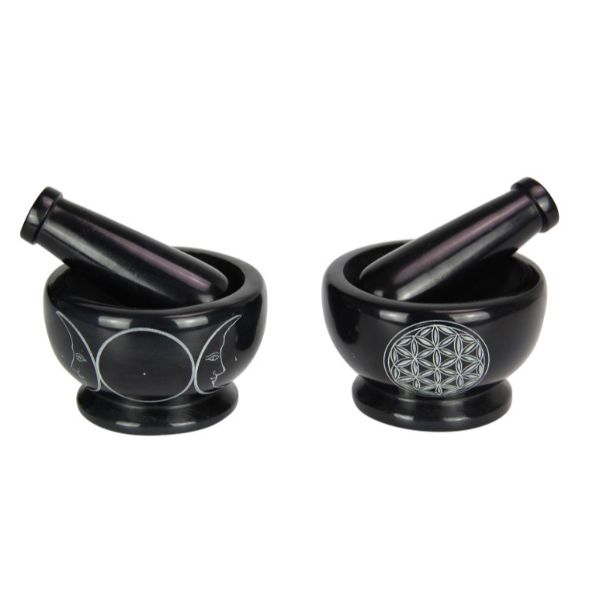 Soapstone Mortar and Pestle with Flower of Life/Triple Moon Design - 10cm