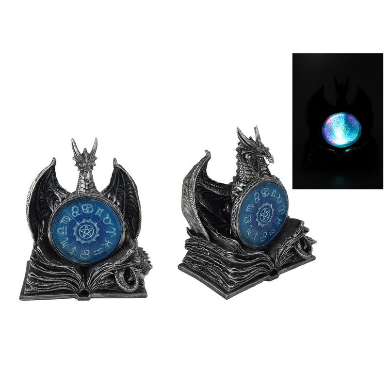 Silver Dragon on Book of Spells Holding Zodiac Light Up Ring - 18cm