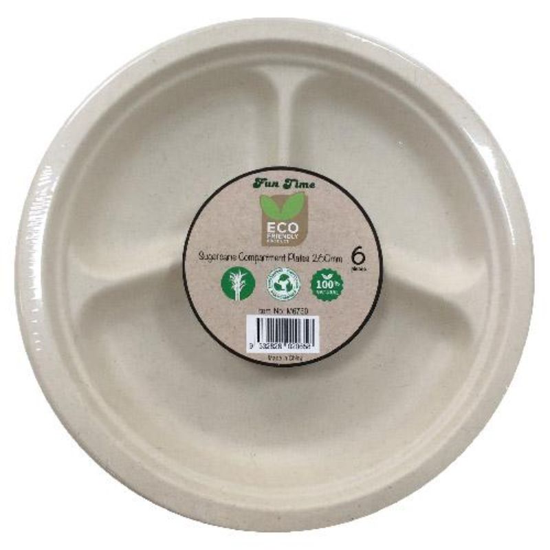 6 Pack 3-Compartment Sugarcane Eco-friendly Plates - 26cm