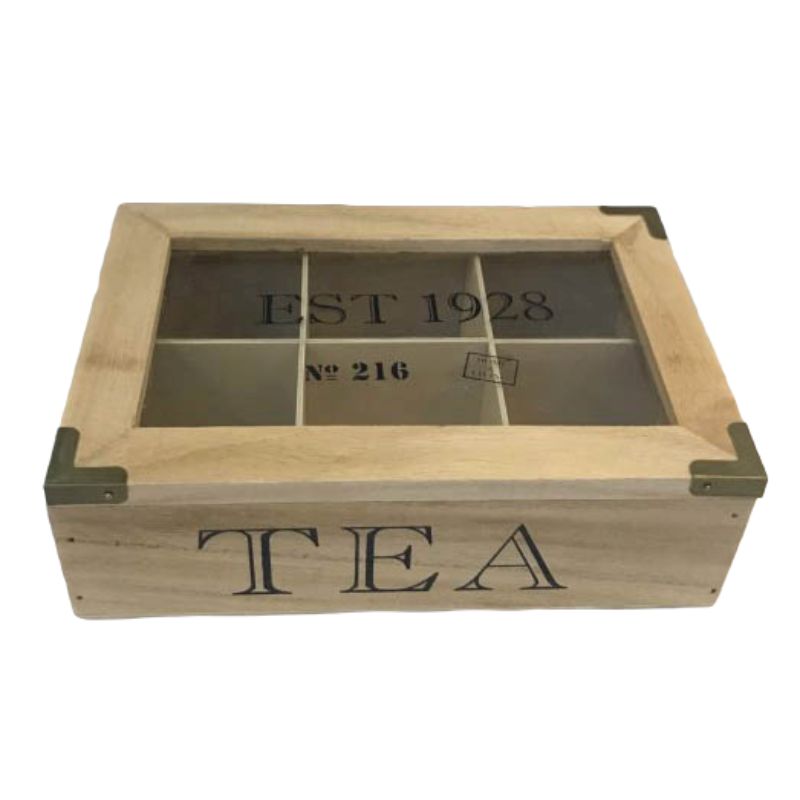 6 Section Wooden Tea Box - 22.8cm x 15.2cm x 7cm