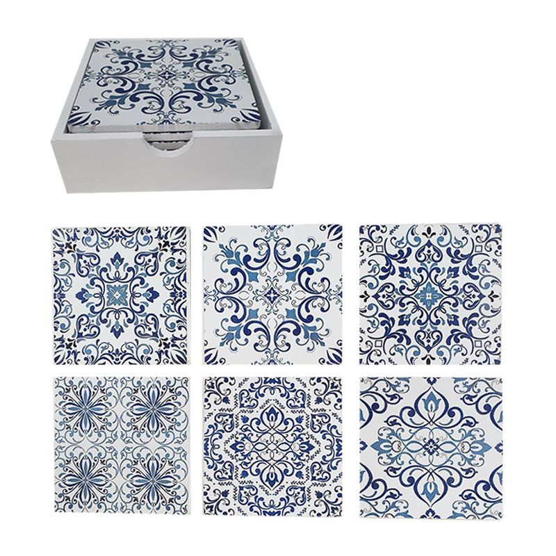 6 Piece Blue Pattern Wooden Coaster Set - 10cm