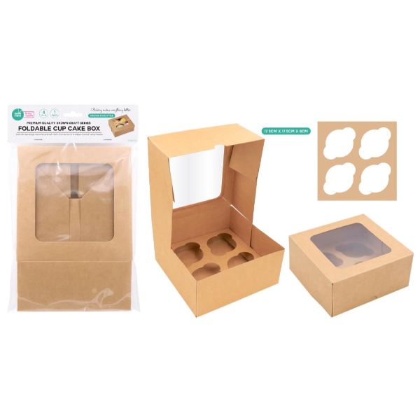 Brown Kraft 4 Cup Cake Section Box With Clear Window Lid - 17.5cm x 17.5cm x 8cm