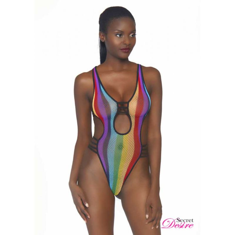 Only 1 left!Rainbow Fishnet Cut Out Bodysuit - OS