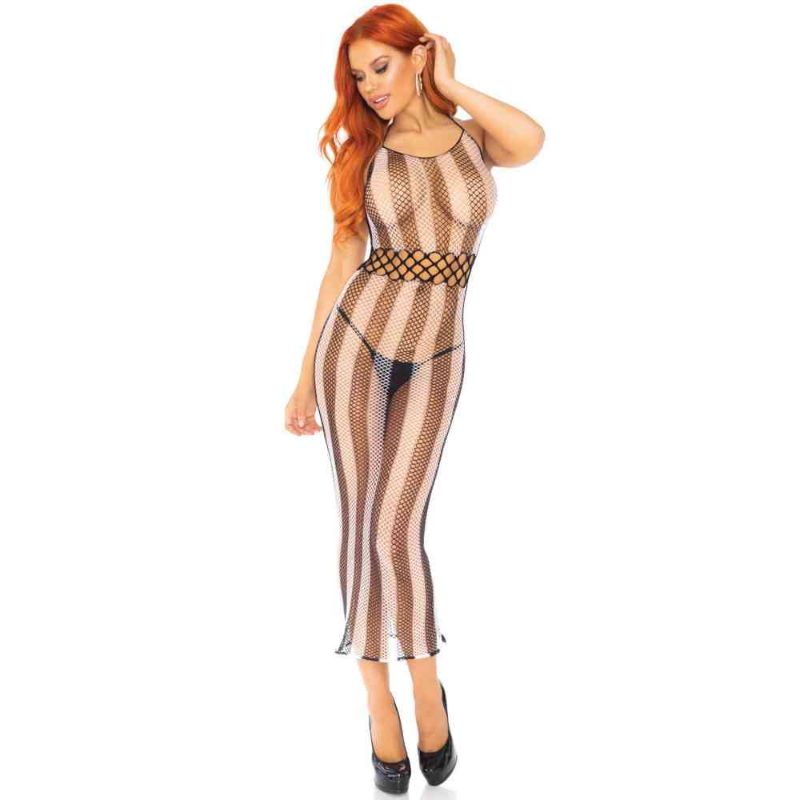 Only 3 left!Black Striped Fishnet Long Halter Dress with Cut Out Detail - OS