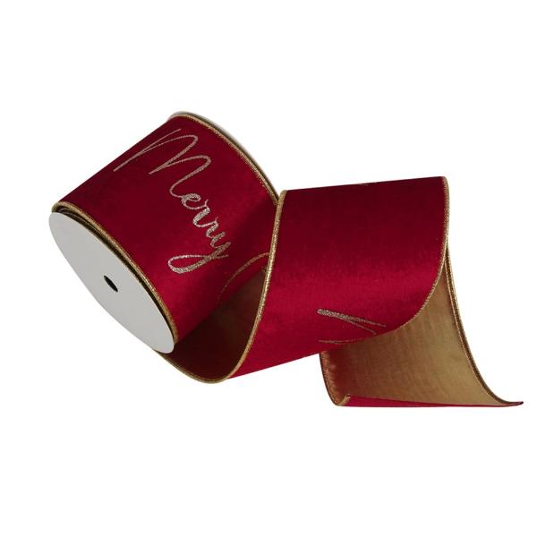 Red Velvet Ribbon With Glitter Merry Christmas & Wire Edge - 10cm x 10m
