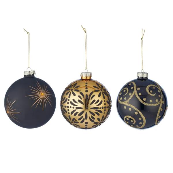 10 in stock10cm Glass Bauble Glitter Blk/Gld 3asst