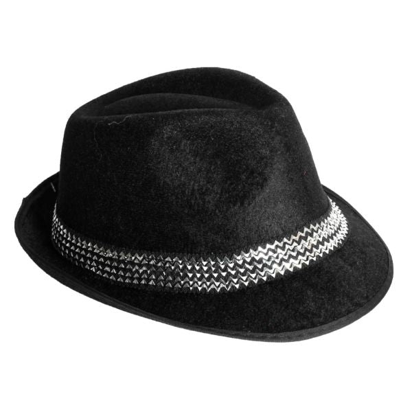 12 in stockBlack Velvet Trilby Rockstar Hat With Metallic Band
