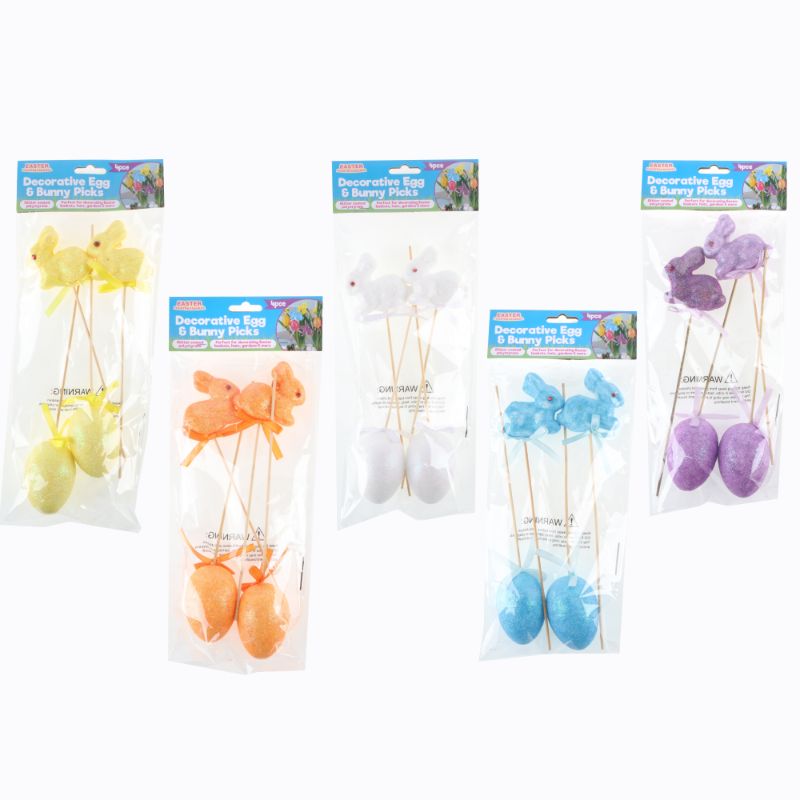 4 Pack Polystyrene Egg & Bunny On Pick with Glitter