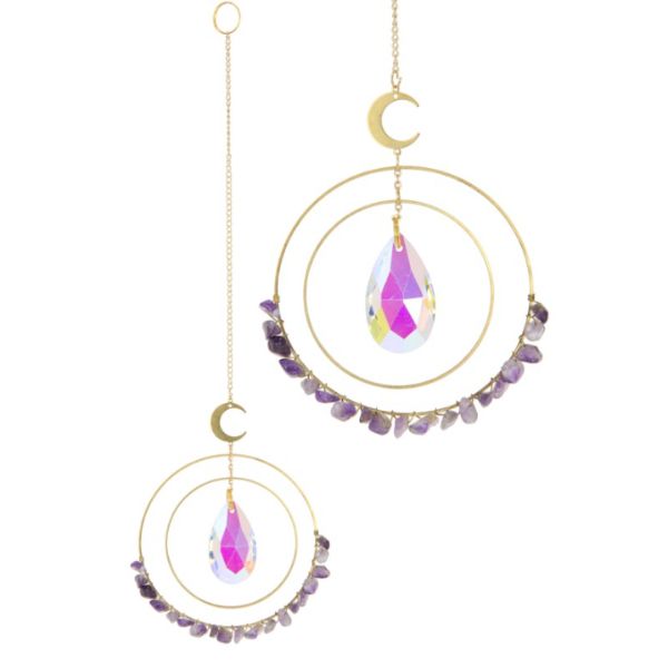 Only 2 left!Round Amethyst Chip Crystal Suncatcher With Crescent Moon Design - 29cm