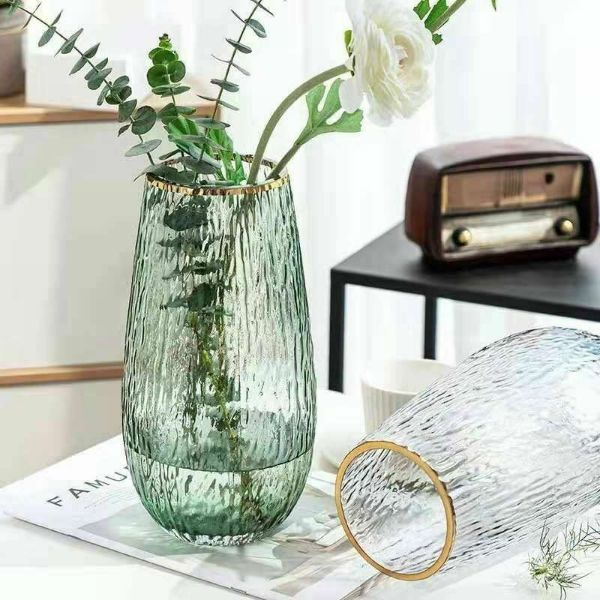 Only 1 left!Ribbed Glass Vase With Gold Rim - 14cm x 27cm