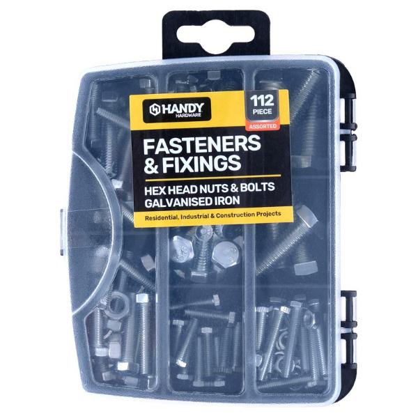 10 in stock112 Pack Galvanised Iron Assorted Fasteners & Fixings Hex Head Nuts & Bolts In Storage Case