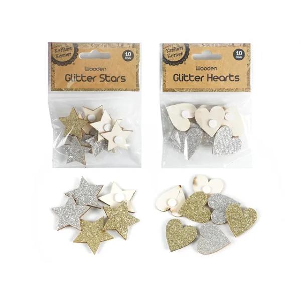 10 Pack Assorted Glitter Shape Wood - 3.5cm x 3.5cm